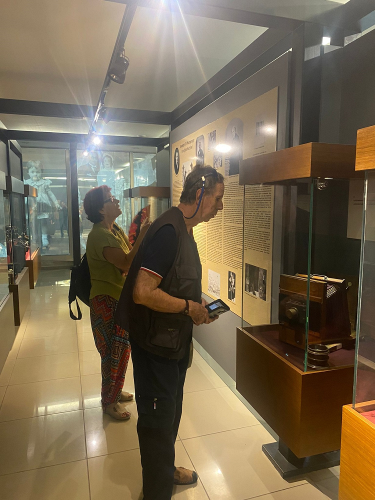 İZMİR (İGFA) – İzmir’in Karşıyaka ilçesinde müzenin bağışçısı, kreatör ve Hamza Rüstem’in torunu Mert Rüstem, müzeyi ziyarete gelen Midilli Adası Fotoğraf Kulübü Başkanı Babis Stilyandis’e, müzede yer alan fotoğraf makinelerinin tarihsel süreçleri tek tek anlatırken, fotoğraflar hakkında da detaylı bilgi verdi.