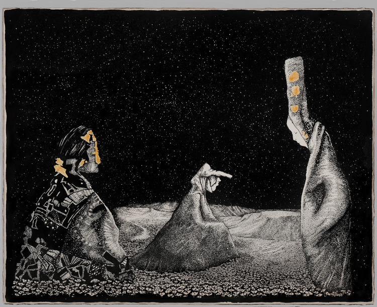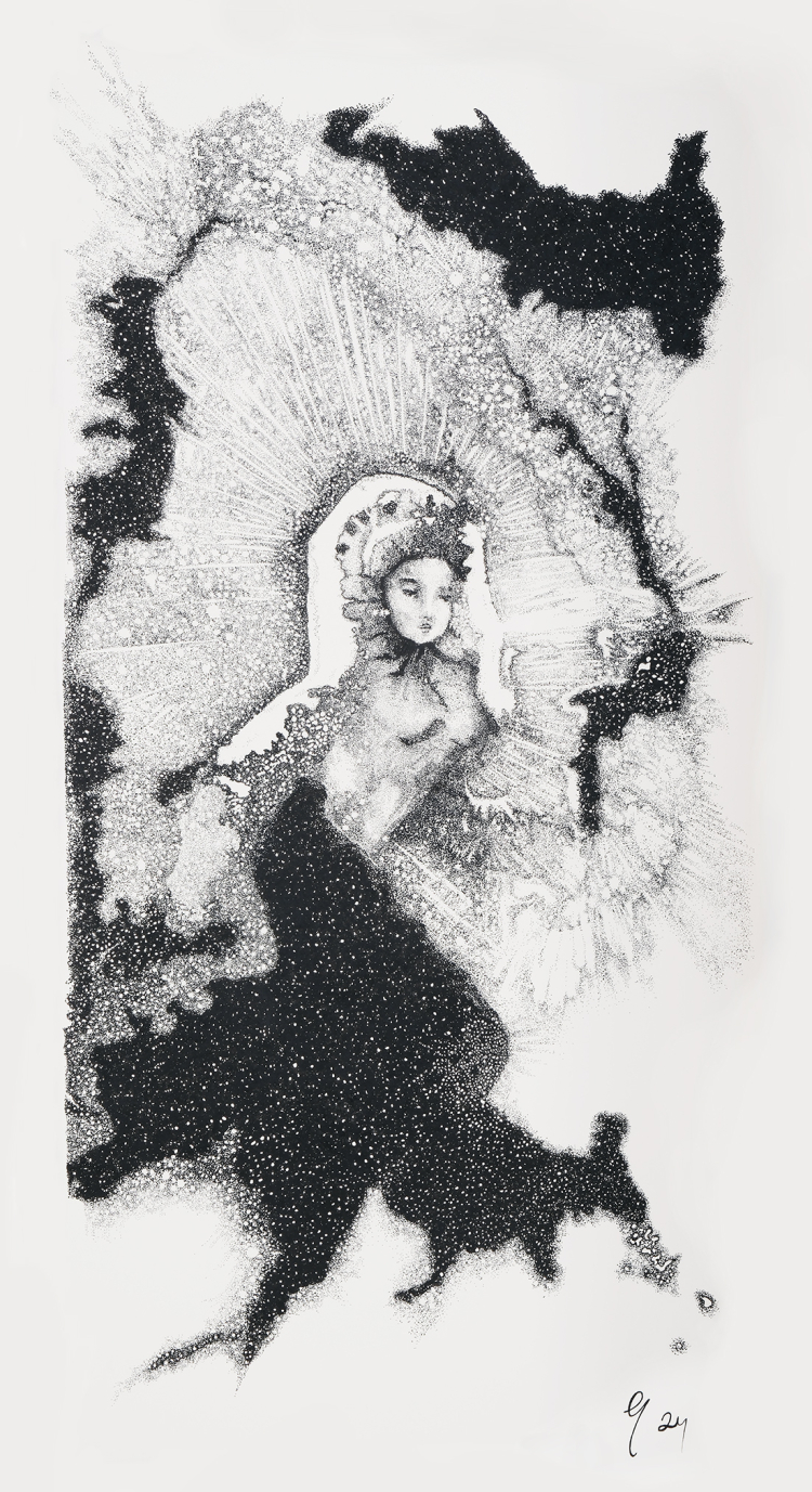 “Kâğıt veya tuval bezi üzerine rapido kalemin noktalarıyla yeniden yorumlanan resimlerin monokrom özelliği, altın yapraklarla derinleştirildiğini vurgulayan Asarkaya,”  Gaia Anlatıları’nın, görsel algının mana alemine aralanan bir kapısından girerek, dijital ortam ile kâğıdı birlikte kullanmasını, mananın maddeye dönüşme süreci olarak görebiliriz.”  Bunun yanında, “yeniden üretim” süreci yönüyle çağdaş sanat olgusuna da bir gönderme yapıyor. Gula, sağlık, şifa ve tıp tanrıçasıdır. Gula, hastaların iyileşmesi ve sağlıklarının geri kazanılması için dua edilen bir tanrıçadır. Babil ve Sümer toplumlarında doktorlar ve şifacılar için kutsal kabul edilmiştir. Dukan Gölü, Süleymaniye, Irak Duqan Lake, Sulaymaniyah, Iraq Bu çalışmada mekân ve figür arasındaki ortak sessizliği, hareketsizliği, bir tür dinginliği görüyoruz: Bu ifadeye tanıklık, bir an mı, şimdi mi, geçmiş mi, gelecek mi yoksa rüya mı bilmiyoruz.”