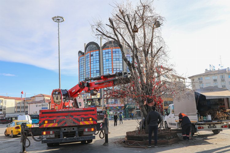 Bilgin, “Bugün itibariyle kuruyan ve yıkılma tehlikesi olan tek ağacımızı Tarihi Kent Meydanımıza uygun, uzun yaşam süresine sahip, kirli havayı emme özelliği olan, dayanıklı çınar ağacımız ile değiştiriyoruz. Bundan sonra da “Tek ağaçta buluşuyoruz” söylemini “çınar ağacının altında buluşuyoruz.” diye yenileyeceğiz. Şehrimizin daha yaşanabilir bir il olması yolunda yaptığımız hizmetlerde önceliğimiz her zaman yeşil alan çalışmaları olmuştur. Bu anlamda bulvarlarımız, caddelerimiz, ana arterlerimiz başta olmak üzere ağaç dikilebilecek her alanı yeşillendirmek adına gerekli çalışmaları yapıyoruz. Gönlümüz isterdi ki tek ağacımız ayakta dursun ve yaşamaya devam etsin ancak yaşanan olumsuzluklar nedeniyle çürümüştü. Biz de uzun yıllar boyunca bu simgeyi ayakta tutacak tek ağaç yerine asırlık çınar ağacımızı tarihi meydanımızla buluşturduk. İnşallah bizden sonrasındaki gelecek kuşaklar bu simge ağacımızı korumaya ve yaşatmaya devam eder. Şehrimize hayırlı olsun.” ifadelerini kullandı.