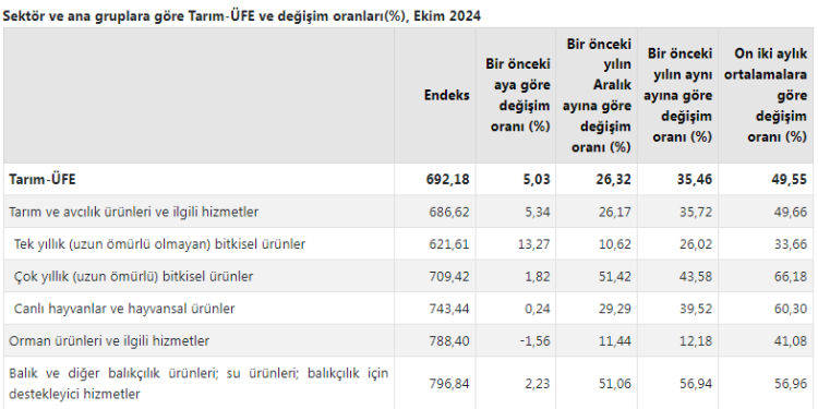 Tarım-ÜFE’de (2020=100), 2024 yılı Ekim ayında bir önceki aya göre yüzde 5,03 artış, bir önceki yılın Aralık ayına göre yüzde 26,32 artış, bir önceki yılın aynı ayına göre yüzde 35,46 artış ve on iki aylık ortalamalara göre yüzde 49,55 artış gerçekleşti.