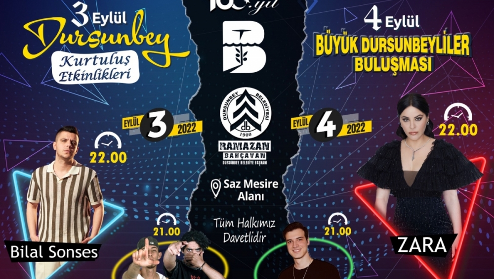 Dursunbey’in düşman işgalinden kurtuluşunun 100. yılı etkinlikleri çerçevesinde gerçekleşecek olan programlar 2 Eylül Cuma günü M. Akif Ersoy Kültür Merkezinde sergilenecek olan ‘Önce Vatan’ tiyatro gösterisi ile başlayacak. 3 Eylül Cumartesi günü sabah saatlerinde gerçekleşecek olan resmi törenlerin ardından, Saz mesire alanında kurulacak olan dev sahnede birçok etkinlik Dursunbeyliler ile buluşacak. Ünlü sunucu Afrikalı Ali’nin sunumu ile akşam saatlerinde gerçekleşecek olan kurtuluş konserinde, Dursunbeyli rap sanatçıları Rastro-Aspar daha sonra ise ünlü sanatçı Bilal Sonses sahne alacak.