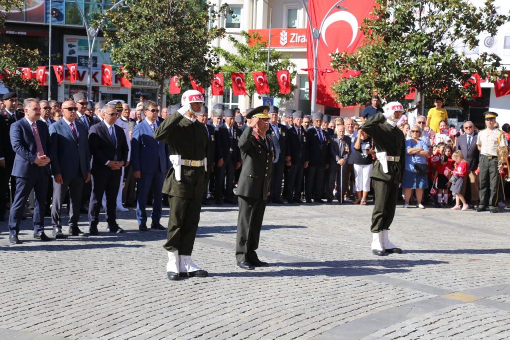 Kaymakam Ahmet Odabaş, 19. Motorlu Piyade Tugayı ve Garnizon Komutanı Tuğgeneral Mehmet Kurugül, Belediye Başkanı Selman Hasan Arslan, Balıkesir Milletvekilleri Mustafa Canbey, İsmail Ok ve diğer protokol mensupları, askeri erkan, muharip gaziler, sivil toplum kuruluşları, dernek ve oda başkanları, muhtarlar ve çok sayıda vatandaşın katıldığı kutlamalarda saygı duruşunda bulunuldu ve İstiklal Marşı okundu.