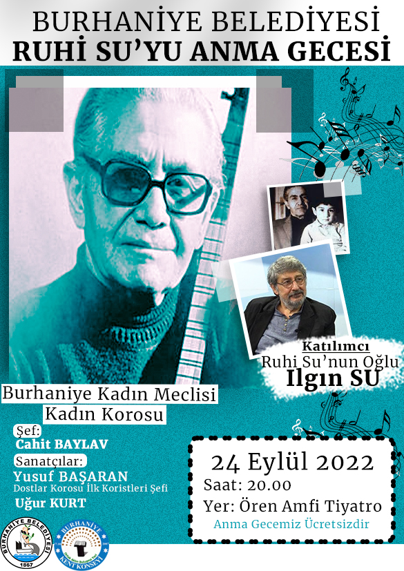 Ruhi Su’nun hayatını, türkülerini ve müziğimize katkılarını anlatılacağı gecede, Oğlu Ilgın Su ve Dostlar Korosu İlk Koristleri Şefi Yusuf Başaran ile Burhaniye Kadın Meclisi Korosundan Ruhi Su türküleri dinletisi katılımcılara sunulacak.