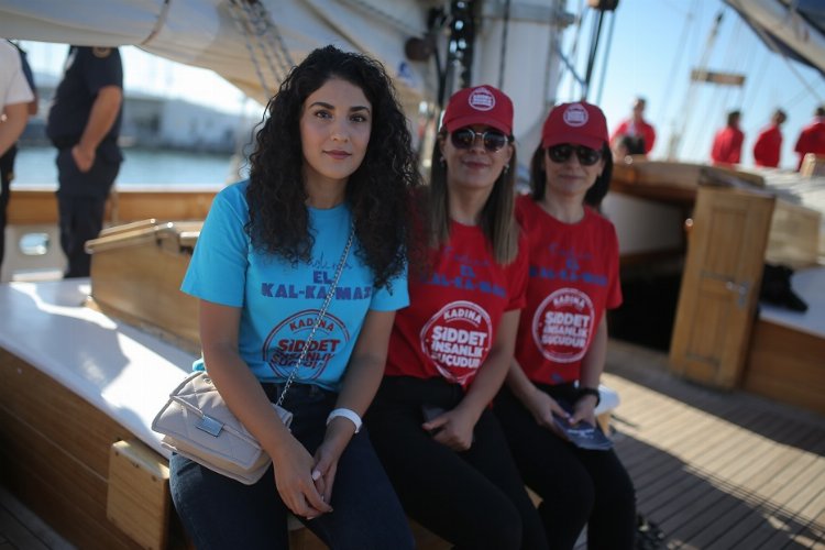 İçişleri Bakanlığı’nın geliştirdiği, kadınların acil durumlarda ilgili birimlere öncelikli olarak ulaşılabilmesini sağlayan KADES uygulamasının bilinirliğinin artırılmasına yönelik olarak gerçekleştirilen etkinlikte, Cumhuriyet tarihinin ilk ve tek okul gemisi STS Bodrum’un yelkenlerinde KADES uygulamasının logosu dev baskı olarak yer aldı.