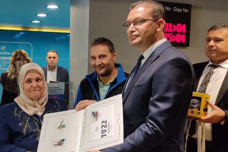 Tural ŞAHBAZLI / KAHRAMANMARAŞ (İGFA) – Kahramanmaraş’ta PTT Şubesi’ne gelen 182’nci müşteri Semra Çerçi ve Erdem Çerçi çiftine, Kahramanmaraş Baş Müdürü Harun Oğuzhanoğlu, Milli Mücadele’nin 100. yılı anısına bastırılan pul koleksiyonu ve albüm hediye etti.