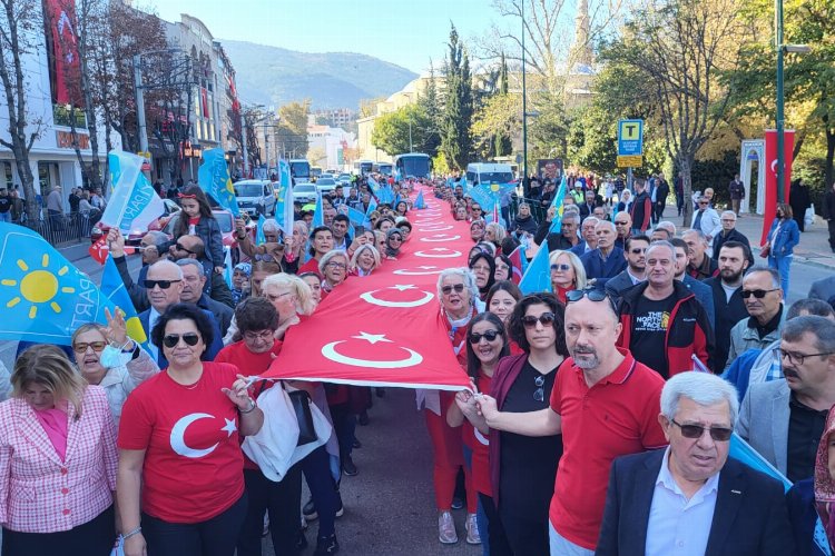 BURSA (İGFA) – 99. Yıl onuruna 99 metre uzunluğundaki dev Türk Bayrağı ile yürüyüş yapan İYİ Partilililer, Atatürk Anıtı’na çelenk sunarak Cumhuriyet’e bağlılık yemini ettiler.