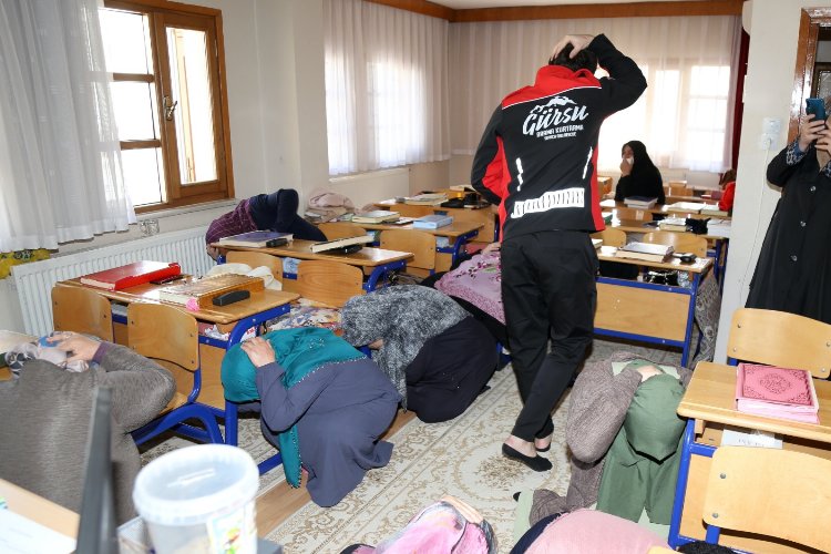 Bursa’da Gürsu Kuran Kursları’nda yapılan deprem tatbikatında, depremden korunma yöntemleri anlatıldı.