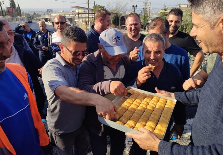 Edirne’nin Keşan ilçesinde Küçük Sanayi Sitesi Başkanı Hakan Gürel, asfalt serimini tamamlayan belediye personeline baklava ikramında bulunarak...