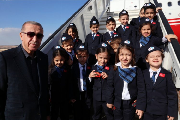 Çocukların, “Sizinle fotoğraf çekinebilir miyiz?” demesi üzerine de Cumhurbaşkanı Erdoğan, uçak merdiveninde minik kondüktörlerle hatıra fotoğrafı çektirdi.