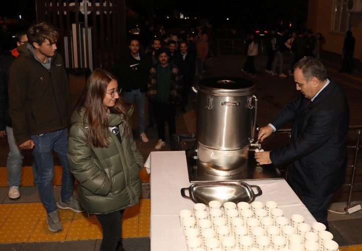 Erciyes Üniversitesi (ERÜ) tarafından vize haftası nedeniyle Merkez kütüphanede geç saatlere kadar ders çalışan öğrencilere sıcak çorba...