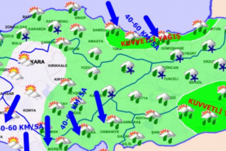Batı ve Doğu Karadeniz’in iç kesimlerinin yüksekleri, İç Anadolu’nun kuzeydoğusunun yüksekleri ile Doğu Anadolu’nun kuzey ve doğusunda karla karışık yağmur ve kar şeklinde olması beklenen yağışların; Orta ve Doğu Karadeniz ile Güneydoğu Anadolu’nun doğusunda ve Ardahan, Muş, Bitlis, Van’ın güneyi, Şırnak ve Hakkari çevrelerinde kuvvetli, Giresun’un ve Artvin’in kıyı kesimleri ile Rize çevrelerinde çok kuvvetli ve yer yer şiddetli olması bekleniyor.