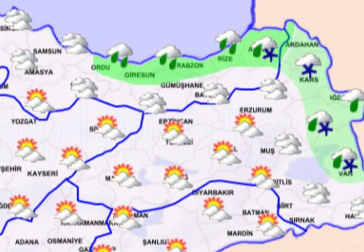 Yurt genelinin parçalı ve çok bulutlu, Kıyı Ege, Doğu Karadeniz kıyıları, Kırklareli, Ordu ve Iğdır çevreleri ile...