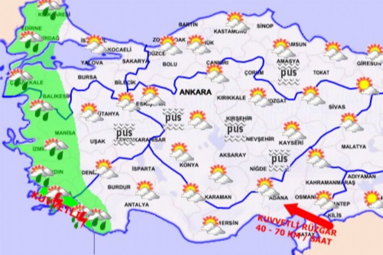 Parçalı ve yer yer çok bulutlu, akşam saatlerinden itibaren Antalya çevrelerinin, gece saatlerinden itibaren Batı Akdeniz ile K. Maraş, Hatay ve Osmaniye çevrelerinin sağanak ve yer yer gök gürültülü sağanak yağışlı geçeceği tahmin ediliyor. Yağışların gece saatlerinde Antalya çevrelerinde yerel olarak kuvvetli olması bekleniyor. Rüzgarın Hatay ile zamanla Osmaniye çevrelerinde doğu ve güneydoğu yönlerden kuvvetli (40-70 km/sa) olması bekleniyor.