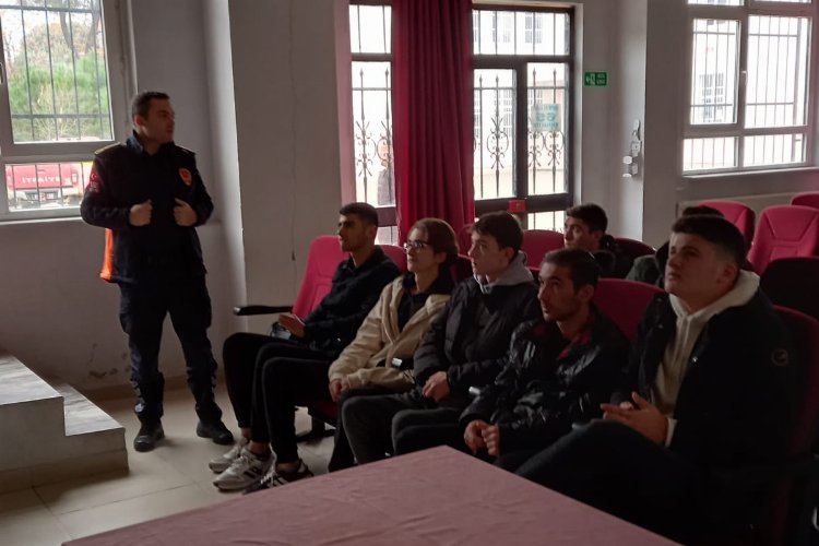 İtfaiye Dairesi Başkanı Gürhan İnal ve eğitmen Mehmet Ateş, öğrencilere itfaiyecilik mesleğini anlattı.