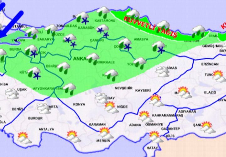 Yurdun batı, orta ve kuzey kesimleri sağanak yağış, karla karışık yağmur ve yer yer kar şeklinde olması...