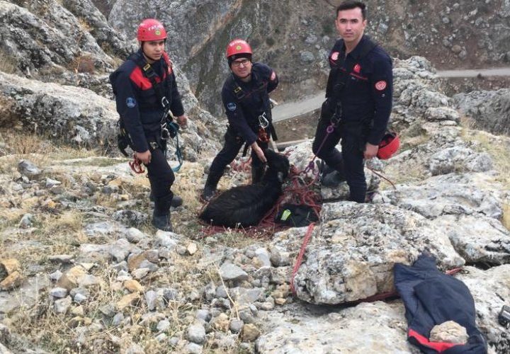 Kayseri Büyükşehir Belediyesi İtfaiye Daire Başkanlığı ekipleri, Develi ilçesinde dağlık arazide 250 metrelik uçurumda mahsur kalan keçiyi,...