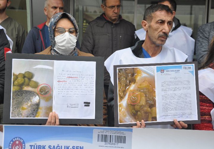 Sağlık çalışanları için üretilen yemeklerde sürekli yabancı cisimler çıkmasına çalışanlar ve Türk Sağlık Sen üyeleri tepki gösterdi....