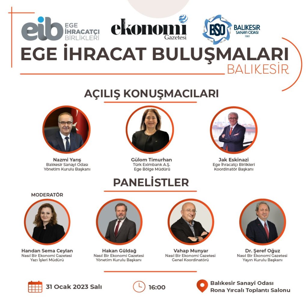 Balıkesir Sanayi Odası’nın ev sahipliğinde gerçekleşecek olan toplantıya, Balıkesir Sanayi Odası Başkanı Nazmi Yarış, Ege İhracatçılar Birlikleri Koordinatör Başkanı Jak Eskinazi, Türk Eximbank A.Ş. Ege Bölge Müdürü Gülom Timurhan, Nasıl Bir Ekonomi Gazetesi yazarları Hakan Güldağ, Vahap Munyar ve Dr.Şeref Oğuz konuşmacı olarak katılacak.
