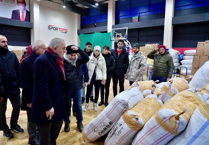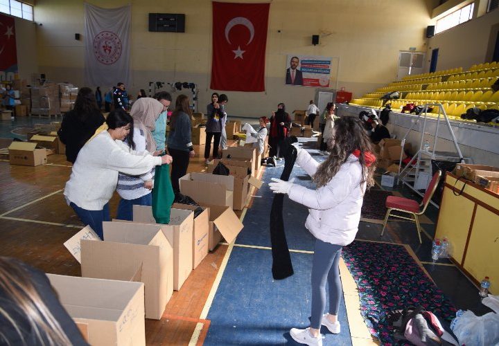 Manisa Valiliği koordinasyonunda deprem bölgesi için başlatılan yardım kampanyası için vatandaşlar, il merkezinde Atatürk Spor Salonu ve...