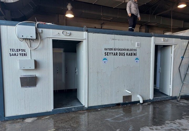 Kayseri Büyükşehir Belediyesi’nin aralıksız sürdürdüğü depremin yaralarını sarma çalışmaları kapsamında 8 duş 2 WC’li seyyar duşakabin bölgeye...