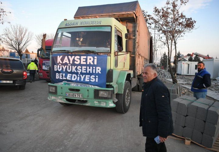Kayseri Büyükşehir Belediye Başkanı Dr. Memduh Büyükkılıç, Kahramanmaraş’taki kurulan konteyner alanında yardım tırlarını karşıladı. Mehmet UZEL (KAHRAMANMARAŞ...
