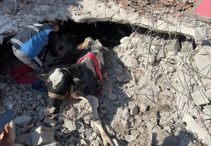 Gölcük Belediyesi ekipleri, depremin 17. gününde; çöken bir ahırdan gelen ses üzerine yaptıkları çalışma ile bir ineği...