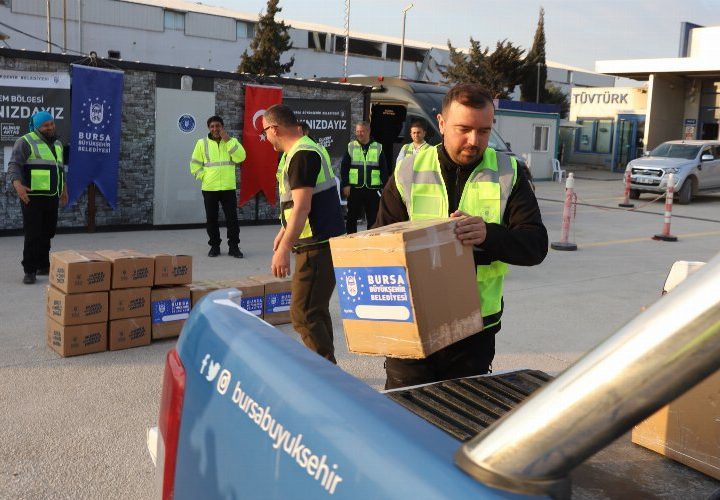 Hatay’da Türkiye genelinden gelen yardımların dağıtımı, geçici yaşam alanlarının oluşturulması ve seyyar tuvaletlerin kurulması görevlerini üstlenen Bursa...