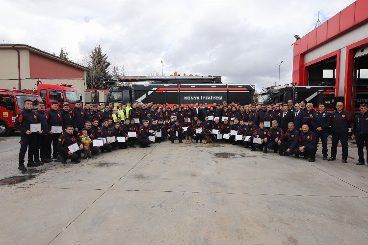 Konya Büyükşehir Belediye Başkanı Uğur İbrahim Altay, deprem sonrası Hatay’da görev yapan ve enkazdan 168 vatandaşın kurtulmasına vesile olan Konya İtfaiyesi personeline teşekkür belgelerini takdim etti.