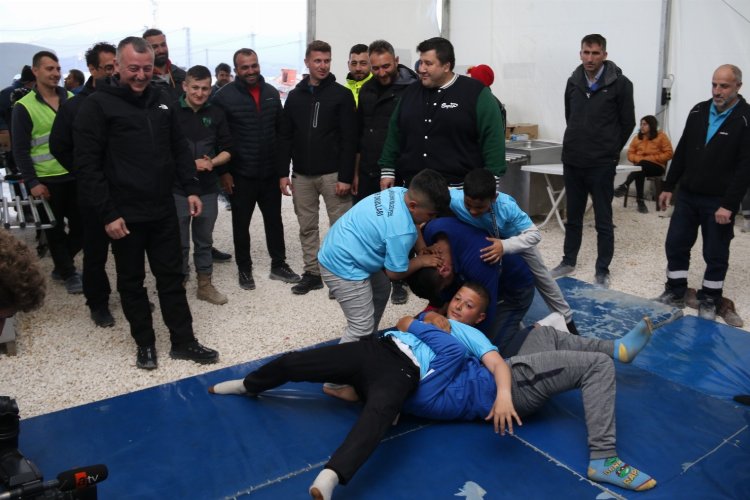 Kocaeli Büyükşehir Belediyesi’nin Defne’deki çadır kentinde depremzede çocuklarla mindere çıkarak güreş tutan başpehlivanlar, çocukların keyifli anlar geçirmesini sağladı