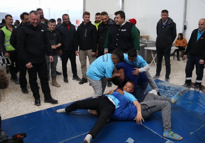 Kocaeli Büyükşehir Belediyesi’nin Defne’deki çadır kentinde depremzede çocuklarla mindere çıkarak güreş tutan başpehlivanlar, çocukların keyifli anlar geçirmesini...