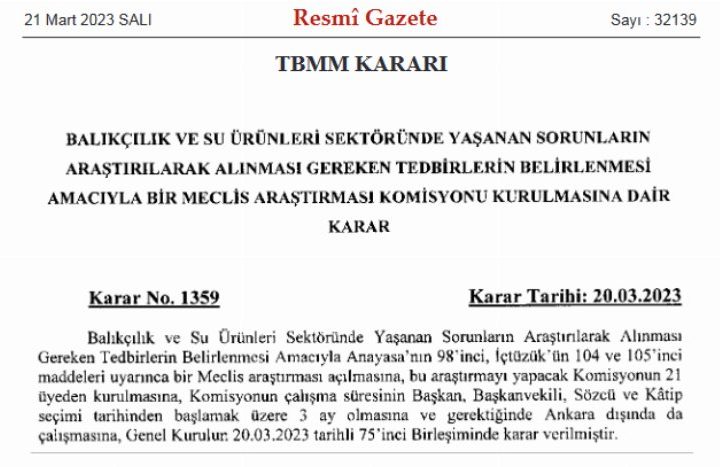 Balıkçılık ve su ürünleri sektörünün sorunlarını tespit etmek üzere Meclis araştırma komisyonu kuruldu. ANKARA (İGFA) – Balıkçılıkla...