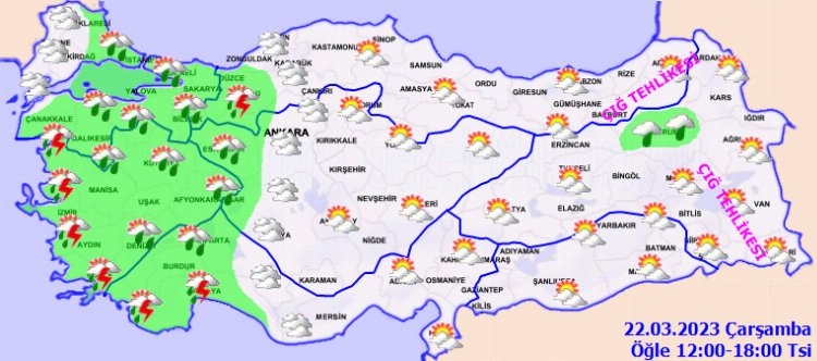 ANKARA (İGFA) – Meteoroloji Genel Müdürlüğü tarafından yapılan son değerlendirmelere göre: Ülke genelinin parçalı ve çok bulutlu, Marmara, Ege, Batı Akdeniz, İç Anadolu(Sivas hariç), Batı Karadeniz, Orta Karadeniz’in iç kesimleri ile Adana’nın kuzey ve doğusu, Osmaniye, Erzurum çevreleri, Kahramanmaraş’ın batısı ve Hatay’ın batı kesimlerinin yağmur ve sağanak, yer yer gök gürültülü sağanak yağışlı geçeceği tahmin ediliyor. Sabah ve gece saatlerinde doğu kesimlerde buzlanma ve don olayı görüleceği tahmin ediliyor. Doğu Karadeniz’in iç kesimleri ile Doğu Anadolu’nun eğimli ve yüksek kesimlerinde çığ tehlikesi riski bulunmaktadır.