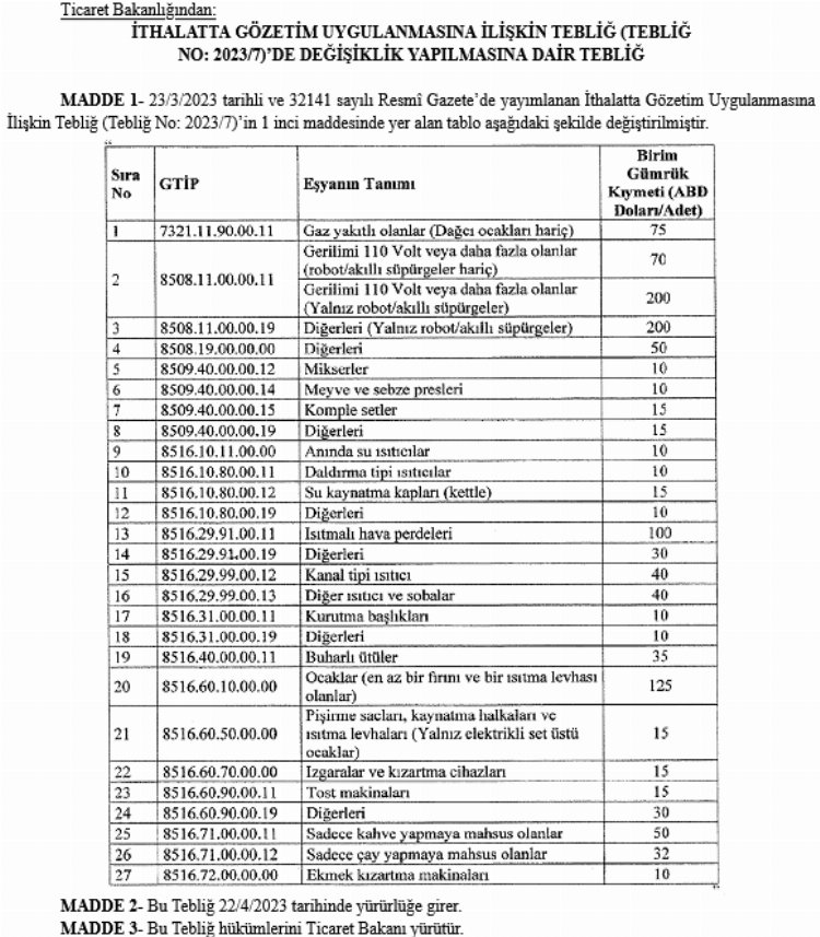 ANKARA (İGFA) – Ticaret Bakanlığı, birim gümrük değeri adet başına 10 ila 200 doların altında olan bazı elektrikli ev cihazlarının ithalatında 23 Nisan’dan itibaren gözetim uygulanacağı 23 Mart’ta açıklamıştı.