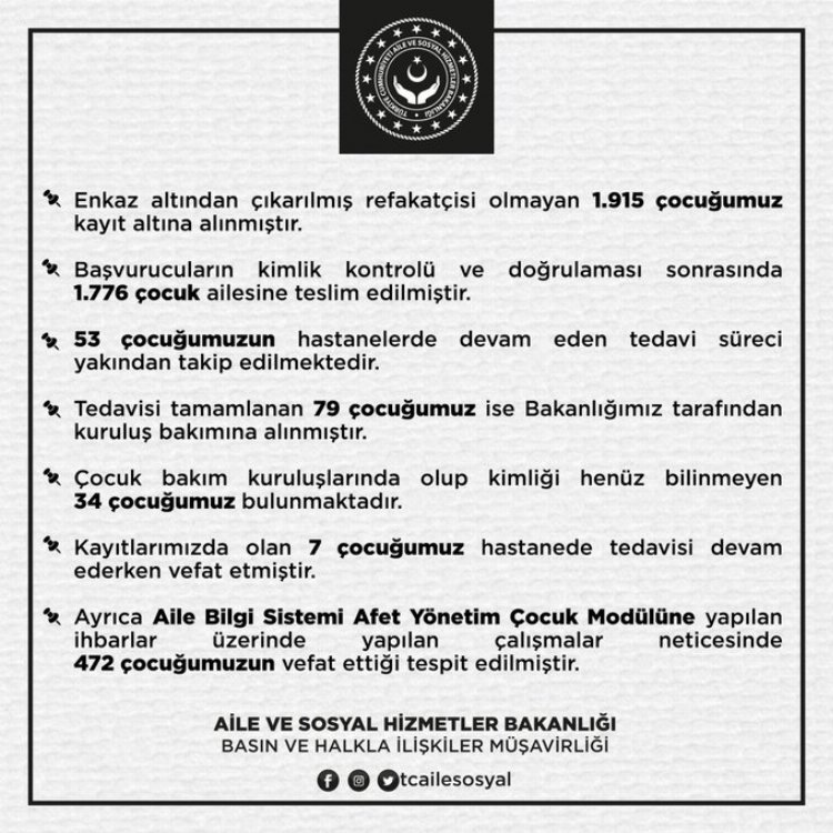 Bakanlıktan yapılan yazılı açıklamada, başvurucuların kimlik kontrolü ve doğrulaması sonrasında bin 776 çocuk ailesine teslim edildiğine dikkati çekilerek, “53 çocuğumuzun hastanelerde devam eden tedavi süreci yakından takip edilmektedir. Tedavisi tamamlanan 79 çocuğumuz ise bakanlığımız tarafından kuruluş bakımına alınmıştır. Çocuk bakım kuruluşlarında olup kimliği henüz bilinmeyen 34 çocuğumuz bulunmaktadır. Kayıtlarımızda olan 7 çocuğumuz hastanede tedavisi devam ederken vefat etmiştir. Ayrıca Aile Bilgi Sistemi Afet Yönetim Çocuk Modülüne yapılan ihbarlar üzerinde yapılan çalışmalar neticesinde 472 çocuğumuzun vefat ettiği tespit edilmiştir” ifadeleri yer aldı.