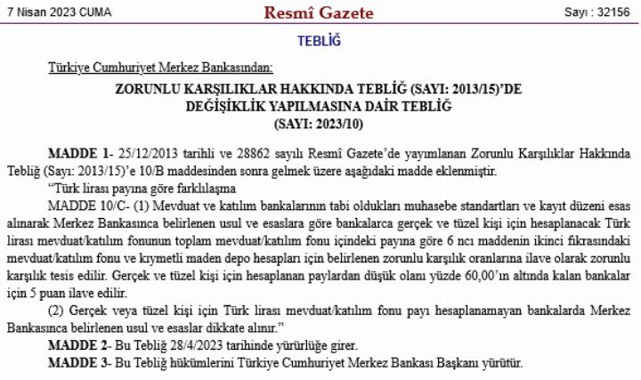 Bankaların toplam mevduatı içinde TL mevduat payının yüzde 60’ın altında kalması halinde tutmak zorunda oldukları ek menkul...