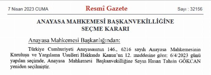 Anayasa Mahkemesi Başkanvekilliği görevine bir kez daha Hasan Tahsin Gökcan’ın seçildiğine ilişkin karar bugün Resmi Gazete’de yayımlandı....