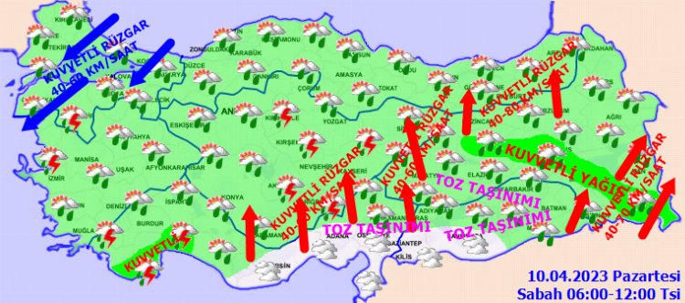 KUVVETLİ RÜZGAR UYARISI: Rüzgarın; Marmara’da kuzey ve kuzeydoğu yönlerden, Doğu Akdeniz’in iç kesimleri, İç Anadolu’nun güney ve doğusu, Doğu Karadeniz’in iç kesimleri ile Doğu Anadolu’nun güneydoğusunda güney yönlerden kuvvetli ve fırtına (40-70 km/saat) şeklinde esmesi beklendiğinden yaşanabilecek olumsuzluklara karşı dikkatli ve tedbirli olunmalıdır.