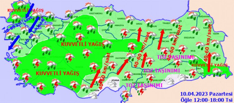 RÜZGAR: Batı kesimlerde kuzey, Doğu kesimlerde güney yönlerden hafif, ara sıra orta kuvvette, Marmara’da kuzey ve kuzeydoğu yönlerden, Doğu Akdeniz’in iç kesimleri, İç Anadolu’nun güney ve doğusu, Doğu Karadeniz’in iç kesimleri ile Doğu Anadolu’nun güneydoğusunda güney yönlerden kuvvetli ve fırtına (40-70 km/saat) şeklinde esmesi bekleniyor.