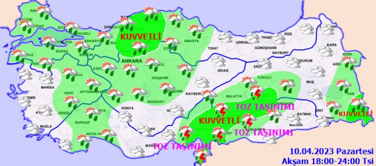 KUVVETLİ YAĞIŞ UYARISI: Yağışların; Marmara, İç Ege, Batı Akdeniz, İç Anadolu’nun kuzeyi ve batısı, Batı Karadeniz, Doğu Anadolu’nun batısı ve güneyi ile Güneydoğu Anadolu’da yerel olarak kuvvetli olması beklendiğinden yaşanabilecek olumsuzluklara karşı dikkatli ve tedbirli olunmalıdır.