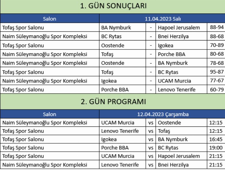 Bu mücadeleyi de uzatmada 95-87 kazanmayı başaran Cem Akdağ’ın öğrencileri grubunda 2’de 2 yaparak günü lider tamamladı. Bu karşılaşmada Mavi Yeşillilerde Özgür Cengiz 33 sayı-7 ribaund-9 asist-5 top çalma ile takımın en skorer ismi olurken; Cem Küçüközkan da 29 sayı-2 ribaund-3 asist ile katkı verdi. Günün diğer maçlarında ise A Grubu’nda Bosna Hersek temsilcisi Igokea M:tel 2’de 2 yapan bir diğer takım oldu.