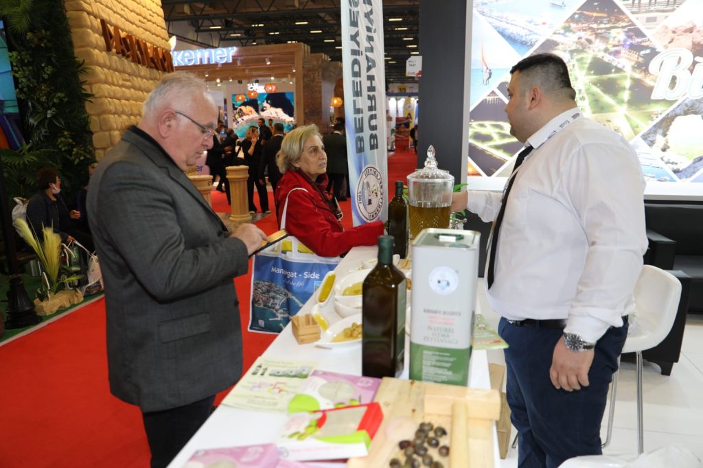 Misafirlerini ağırlayan Burhaniye Belediyesi standında, yağlı pidesinden kırma zeytinine, baklavasından düğün mantısına Burhaniye Mutfağını sergilerken, Belediyenin kendi üretimi olan zeytinyağı ve zeytinyağı sabunlarının yanı sıra boynuzdan yapılma Kızıklı bıçakları da yoğun ilgi görmekte. Deve güreşlerinin tanıtımı için yer alan sembolik deve heykeli, ilçenin mahallelerinin yazdığı tabela, zeytin emekçisi bir kadını temsil eden soğuk heykel sanatçısı ve birçok tanıtım ürünü ile dikkat çeken Burhaniye Belediyesinin standını EMITT Fuarına gelen katılımcılar uğramadan geçmiyor.