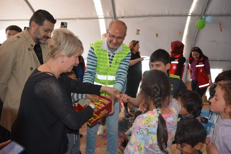 Dünya Başkanı Jennifer Jones ve beraberindeki heyet daha sonra Yunus Emre Mahallesi’ndeki çadır kenti ziyaret ederek burada çocuklarla ve depremzedelerle uzun süre sohbet eden Jones, daha sonra depremzede ailelere gıda yardımı da atarak çadırda onlarla sohbet etti.