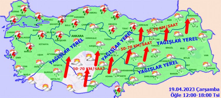KUVVETLİ RÜZGAR UYARISI: Rüzgarın, Akdeniz’in iç kesimleri, İç Anadolu’nun güney ve doğusu, Orta ve Doğu Karadeniz’in iç kesimleri ile Doğu Anadolu’nun batısında güney yönlerden kuvvetli olarak (50-70 km/saat) esmesi beklendiğinden yaşanabilecek olumsuzluklara karşı dikkatli ve tedbirli olunması gerekmektedir.