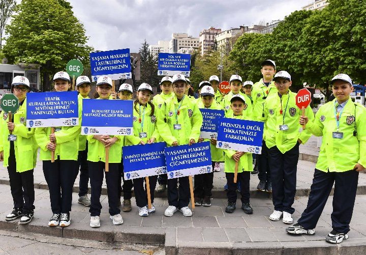 Yanlarında Trafik Denetleme Şube Müdürlüğünden görevli polislerle Kızılay’daki trafiği denetleyen minik trafik polisleri, sürücü ve yayalara trafik...