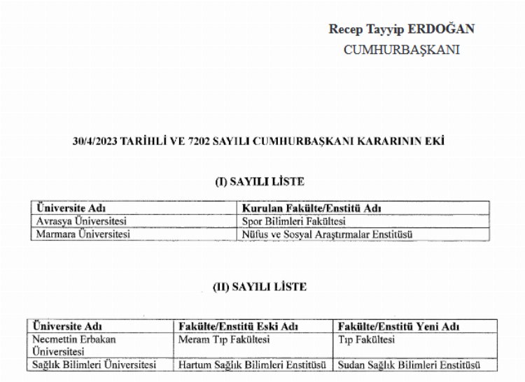 Söz konusu Resmi Gazete’deki karara göre, Necmettin Erbakan Üniversitesi’nde “Meram Tıp Fakültesi”nin adı “Tıp Fakültesi” olarak, Sağlık Bilimleri Üniversitsi’nde “Hartum Sağlık Bilimleri Enstitüsü”nün adı “Sudan Sağlık Bilimleri Enstitüsü” olarak değiştirildi.