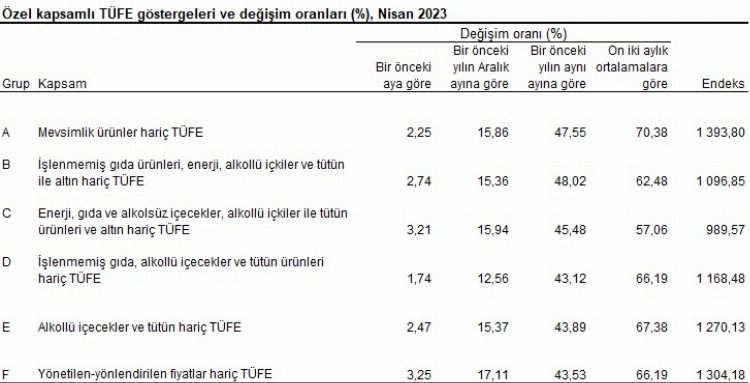 İşlenmemiş gıda ürünleri, enerji, alkollü içkiler ve tütün ile altın hariç TÜFE’deki değişim, 2023 yılı Nisan ayında bir önceki aya göre yüzde 2,74, bir önceki yılın Aralık ayına göre yüzde 15,36, bir önceki yılın aynı ayına göre yüzde 48,02 ve 12 aylık ortalamalara göre yüzde 62,48 olarak gerçekleşti.