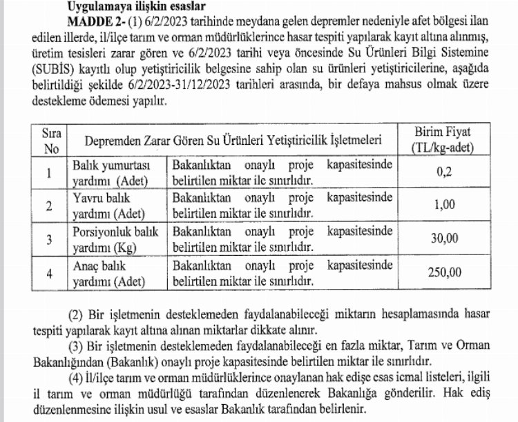Öte yandan yine bugünkü Resmi Gazete’de yayımlanan Deniz ve İç Sularda Avcılık Yapan Balıkçıların Desteklenmesine İlişkin Karara göre de, 5 metreden küçük balıkçı teknelerine Adana’da 5 bin, Hatay’da 10 bin lira tutarında yardım yapılması kararlaştırıldı.