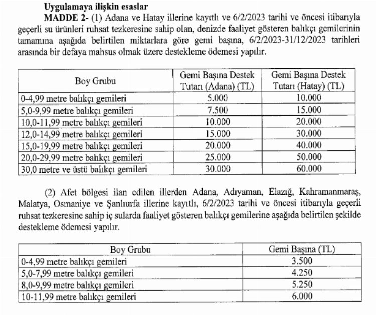 Öte yandan yine bugünkü Resmi Gazete’de yayımlanan Deniz ve İç Sularda Avcılık Yapan Balıkçıların Desteklenmesine İlişkin Karara göre de, 5 metreden küçük balıkçı teknelerine Adana’da 5 bin, Hatay’da 10 bin lira tutarında yardım yapılması kararlaştırıldı.