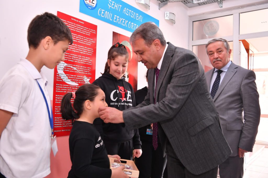 Okul ziyaretinde öğretmenlerle de bir araya gelen Vali Şıldak okulun uyumlu ve verimli çalışma ortamında her bir öğretmenin payı olduğunu söyledi. Şehit Astsubay Cemil Erkek Ortaokulunun yeni kurulan bir okul olmasına rağmen yükselen başarısında emekleri olduğu için öğretmenlere teşekkür etti.