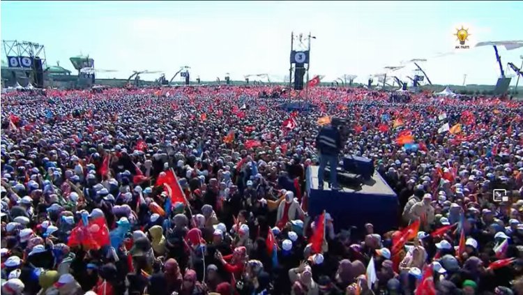 “Bahçelievler-Kirazlı metrosunu, Yenikapı-İncirli-Sefaköy metrosunu, Halkalı- İstanbul Havalimanı raylı sistem bağlantısını bu yıl bitiriyoruz. Altunizade-Bosna Bulvarı raylı sistemini seneye tamamlıyoruz, Gebze-Yavuz Sultan Selim Köprüsü, Havalimanı-Halkalı hızlı tren hattı ihale aşamasına geldi. Ayasofya’yı tekrar camiye dönüştürerek Fatih’in emanetine sahip çıktık. İstanbul’u Türkiye Yüzyılına hazırlıyoruz. Türkiye Yüzyılının yükselişinin lokomotifi de yine İstanbul olacak. Haftaya Pazar günü sandığa gidene kadar çok çalışıyoruz. Şimdi Kandil’dekilerin dini var mı? Kitabı var mı? Bunların ezanı var mı? İşte Bay Bay Kemal onları arkasına almış ne diyor? Haydi, haydi, haydi… Benim milletim de size haftaya Pazar ne diyecek. Ben size güveniyorum, size inanıyorum, size güveniyorum. Haftaya Pazar sandıkları patlatacağınıza inanıyorum. Biz yerliyiz, biz milliyiz ve biz vatanseveriz. Bunlara da vatanımızı böldürmeyeceğiz”.